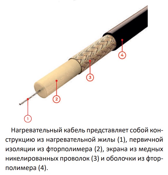 Нагревательный кабель представляет собой конструкцию из нагревательной жилы, первичной изоляции из фторполимера, экрана из медных никелированных проволок и оболочки из фторполимера.