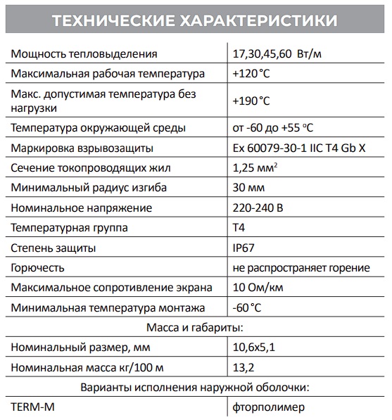 Среднетемпературный саморегулирующийся нагревательный кабель серии TERM-M с взрывозащитой и оболочкой из фторполимера. Кабель применяется для защиты от замерзания труб, емкостей и запорной арматуры. Также используется в поддержании температуры продукта в трубах, бочках и резервуарах, в т.ч. в взрывоопасной зоне, а также применяется для обогрева технологического оборудования.