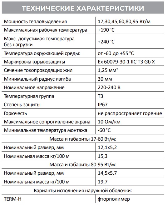 Высокотемпературный саморегулирующийся нагревательный кабель серии TERM-Н с взрывозащитой и оболочкой из фторполимера. Кабель применяется для защиты от замерзания труб, емкостей и запорной арматуры. Также используется в поддержании температуры продукта в трубах, бочках и резервуарах, в т.ч. в взрывоопасной зоне, а также применяется для обогрева технологического оборудования.
