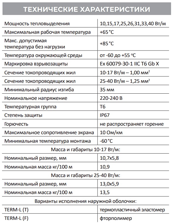 Низкотемпературный саморегулирующийся нагревательный кабель серии TERM-L с взрывозащитой в двух вариантах оболочки. Кабель применяется для защиты от замерзания труб, емкостей и запорной арматуры. Также используется в поддержании температуры продукта в трубах, бочках и резервуарах, в т.ч. в взрывоопасной зоне, а также применяется для обогрева технологического оборудования.