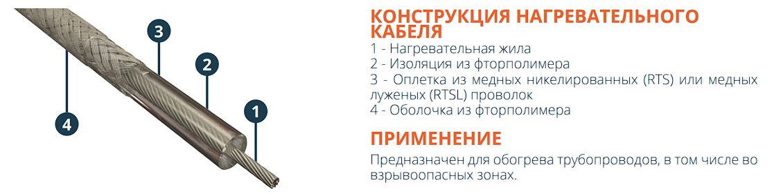 Одножильный резистивный кабель серии RTS для обогрева трубопроводов, в том числе во взрывоопасных зонах. Оплетка из медных никелированных проволок и внешняя оболочка из фторполимера.