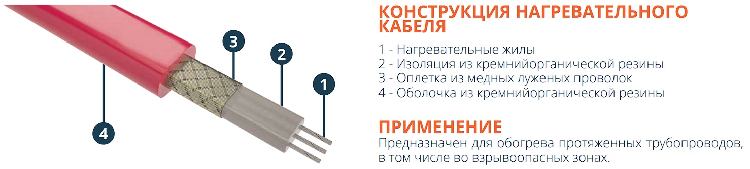 Трехфазный нагревательный резистивный кабель с тремя медными нагревательными жилами, изоляцией из кремнийорганической резины, оплеткой из медной луженой проволоки и оболочкой из кремнийорганической резины. Предназначен для обогрева протяженных трубопроводов, в том числе во взрывоопасных зонах.