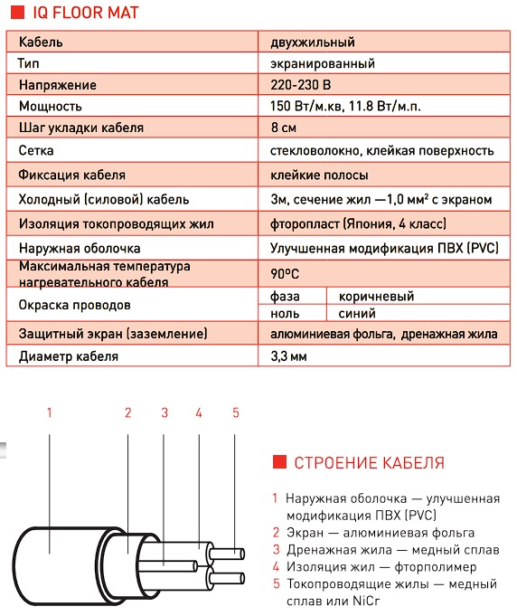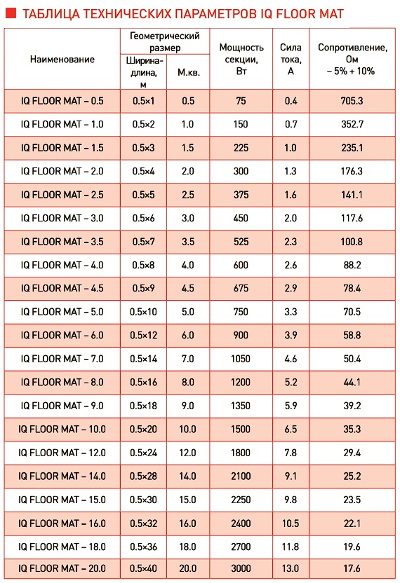 Погонная мощность 11,8 Вт на м.п. (150 Вт на м2) Поставляется секциями 1...9 м2., напряжение 230 В.