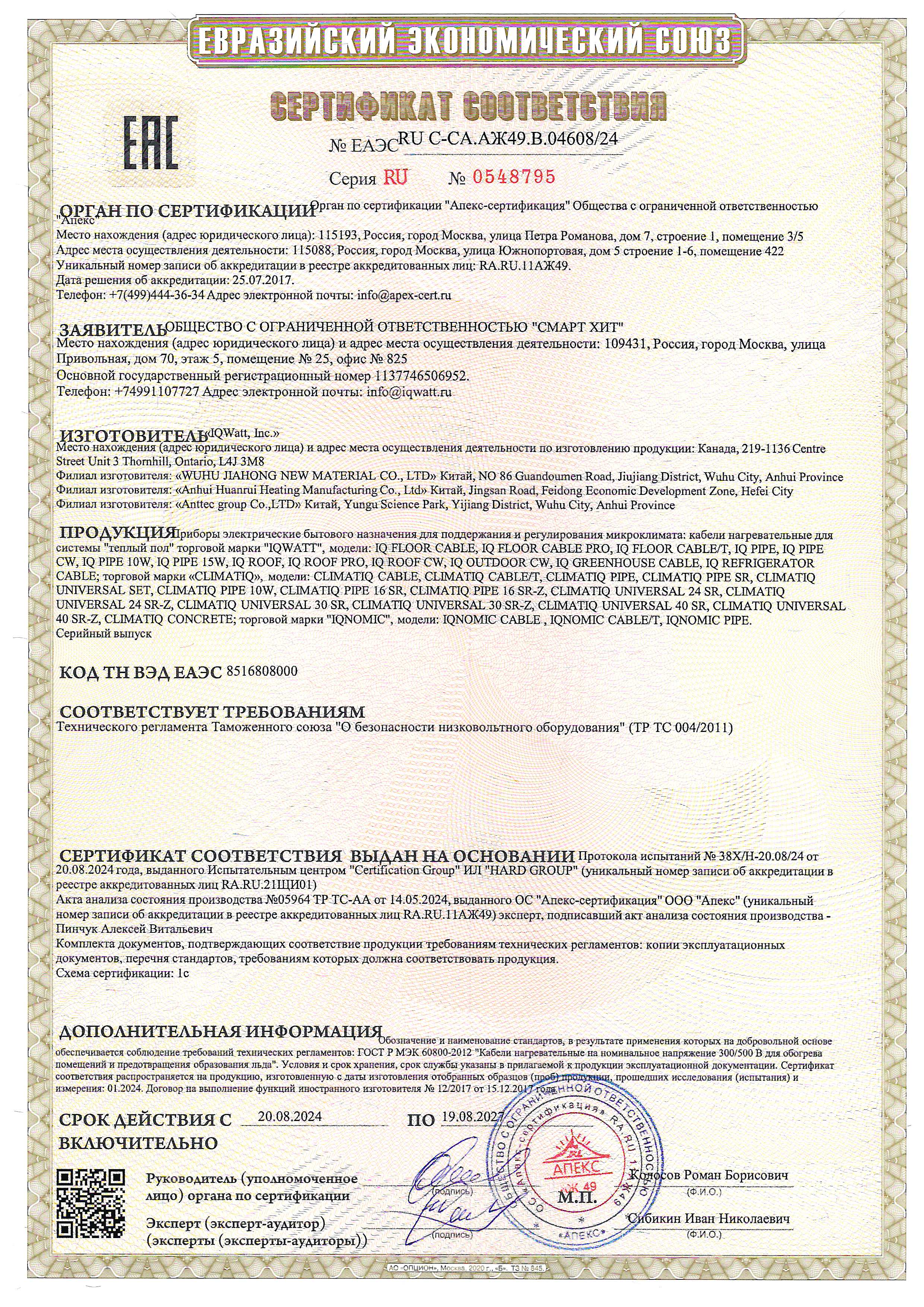 Комплект IQ PIPE CW поставляется с холодным (силовым) проводом длиной 2 метра и герметичной штепсельной евро-вилкой для подключения к электрической сети с заземлением.