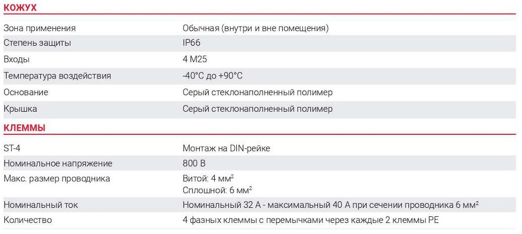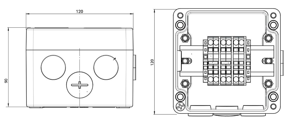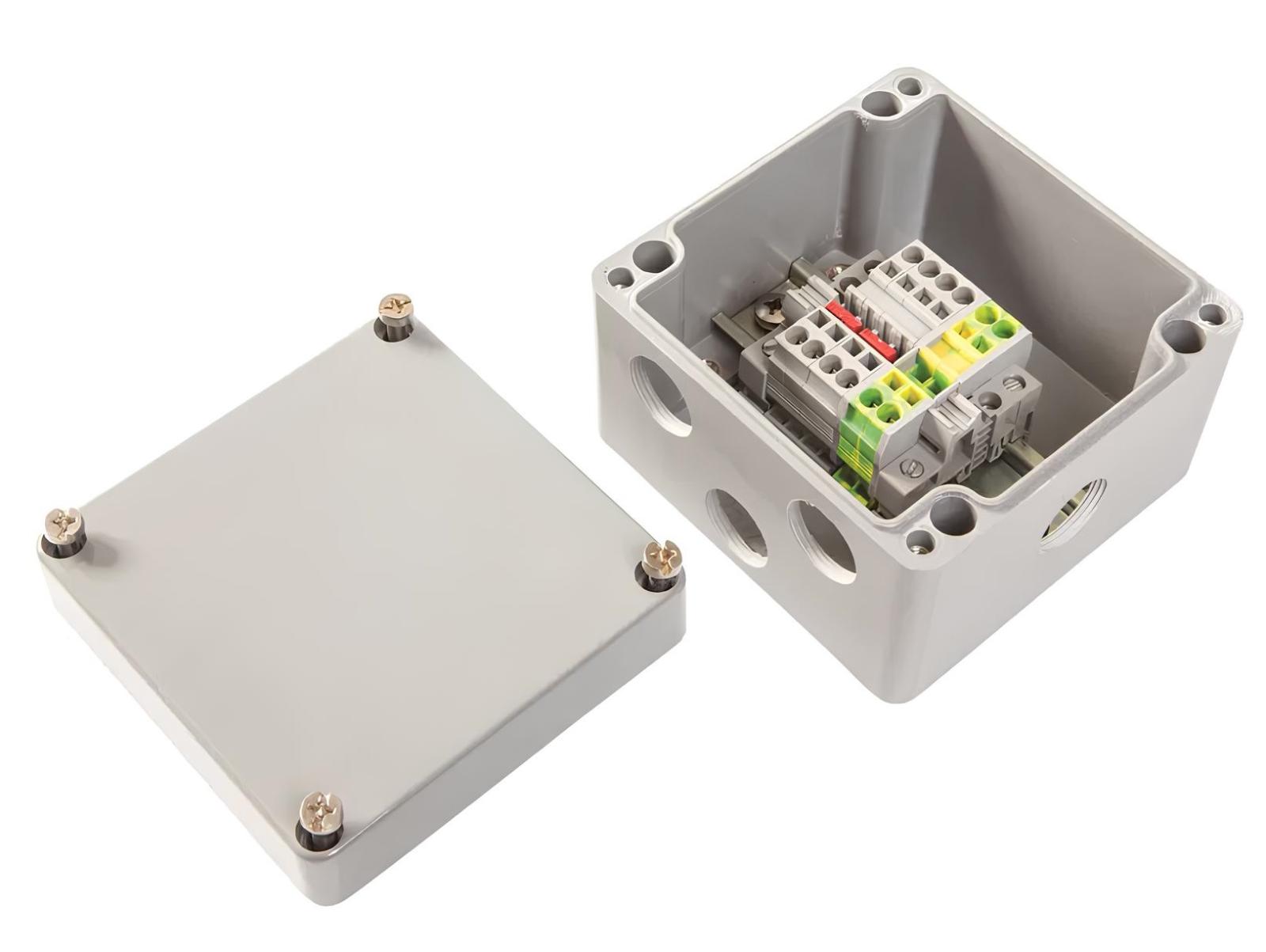 Представляет собой стандартную распределительную коробку для безопасных зон. Материал корпуса - поликарбонат армированный стекловолокном. Размер коробки - 120x120x90мм.