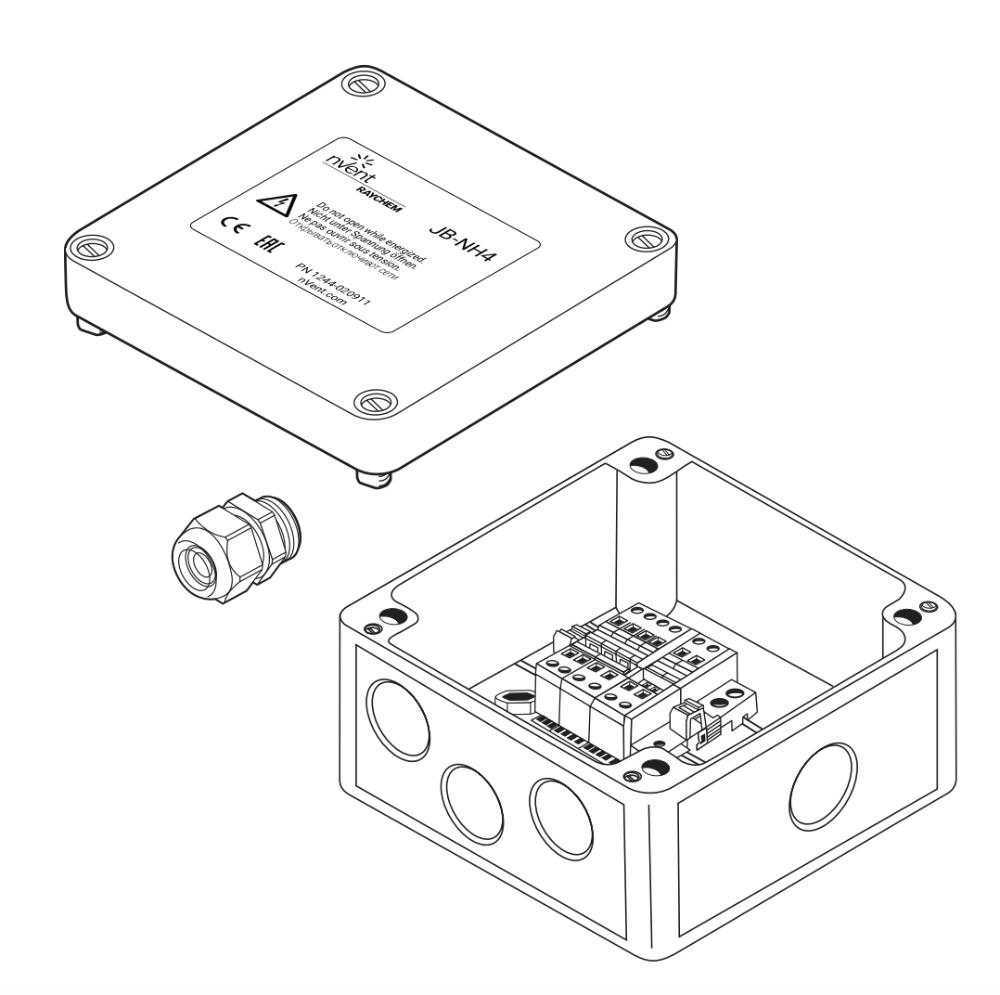 Распределительная коробка может использоваться при выполнении силовых соединений, спайки и концевой заделки, а также применяется в сочетании с промышленным параллельным греющим кабелем бренда Raychem.