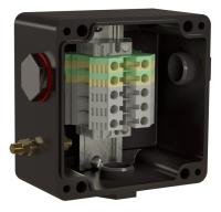 Применяемые клеммные наборы позволяют выполнить подключение многожильных или одножильных кабелей сечением от 0,5 до 10 мм². Нагревательная секция выводится из коробки с помощью кабельного ввода BM-X5S или FETG/TS2 и вводится под тепловую изоляцию с помощью устройства ввода УВ или УВ-М.