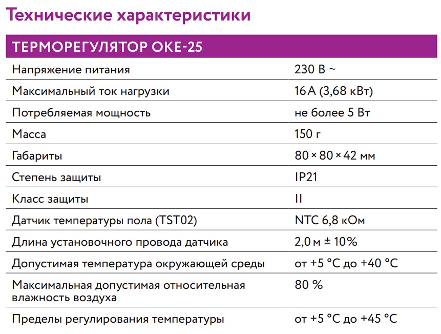 Терморегулятор ОКЕ-25 предназначен для управления электрическими системами обогрева помещений и поддержания комфортной температуры обогреваемой поверхности при помощи датчиков воздуха/пола. Датчики входят в комплект поставки и работают попеременно.