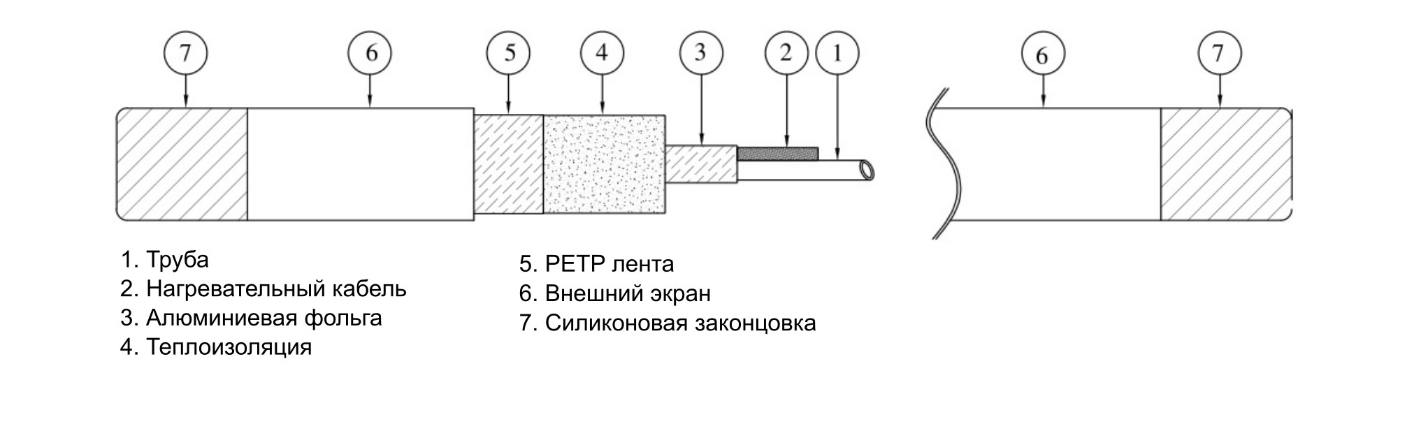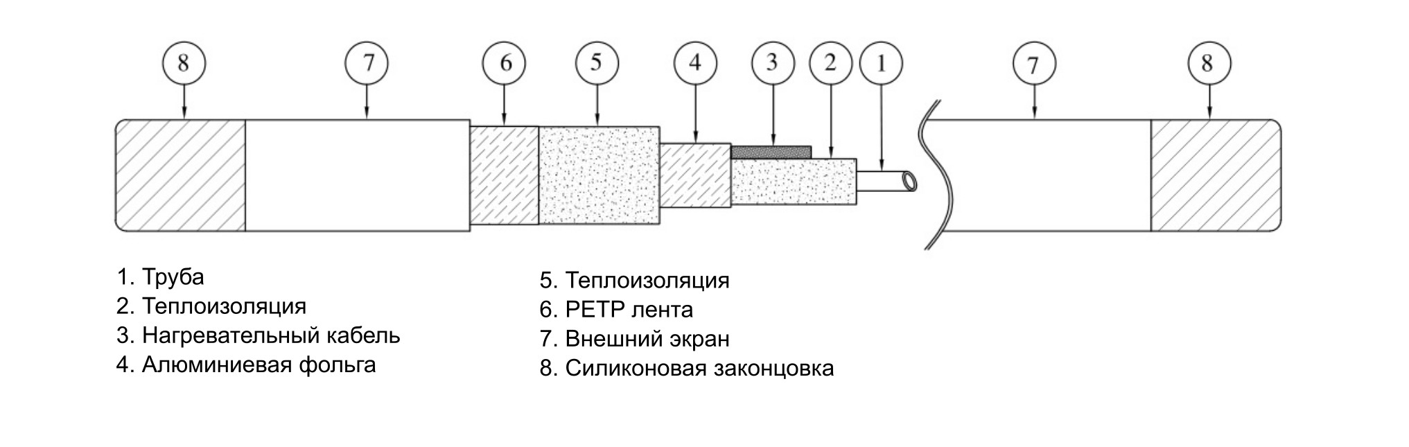 Предизолированные импульсные трубки изготавливаются на основе трубы малого диаметра (1 или 2) из нержавеющей стали (SS316L) или фторопласта (PTFE), негигроскопичной термоизоляции (Non-Hygroscopic Fiber Glass), алюминиевой фольги, нагревательного кабеля – саморегулируемого или резистивного и наружной полимерной оболочки.